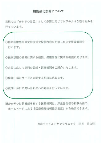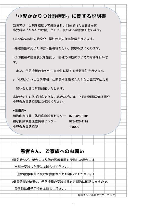 月山啓が小児科を選んだ理由は、難病があり5年間しか延命できないとして、人生でどの5年間をとるべきかを考えた時、私個人としては小児期の5年間がもっとも変化に富み、有意義であったのではないかと思ったからです。1年1年が本当に長く感じ、クリスマスが来るのが本当に楽しみであった、医者として、その年月をなんとかしてやあげたいと考えました。医者になってからは、いかに小児医療がしいたげられているかを目のあたりにして愕然としました。お金がないから、選挙の票がないから、とはよく言ったものですが、本当に目先のことばかりに目がいってしまって、教育や小児医療などに政治家および行政は見向きもしません。小児医療は老人や成人医療に比べ冷遇されていると言うのが小児科医の正直な感想です。少子高齢化と言われていますが、母親が心配なく子育てをできる環境にするためには一小児科医としてなにができるかと考え、曜日設定をおこないました。曜日に左右されない環境(日曜日に熱がでた子と月曜日にでた子で違いはない)にしたいという願いであり、公共病院の休診日をうめることが当院の使命と考えています。地域の子供達を地域全体で診療していこうという理念ですので、土曜日、日曜日に遠方より受診された方、かかりつけ医がおられる方など次回は近くで受診していただいて結構です。予防接種につきましても接種率の低下が指摘されており、曜日設定を土曜日、日曜日にも設定しました。子育ての環境を変えないと少子は改善しない、というのが私の結論です