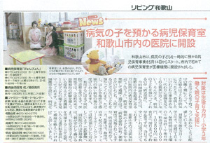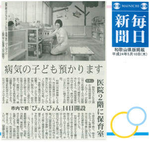 病児保育事業は、病気の回復期に至っていないため集団保育が困難な児童を一時的にお預かりする市町村の委託事業です。子どもが病気の際には保護者がお休みしていただいて看病いただくのが理想ですが、保護者の勤務等の都合により家庭で保育を行うことが困難な場合、施設でお預かりさせていただくことをいいます。医療法人三日月会が運営する病児保育室『ぴょんぴょん』は和歌山市初の病児対応型として平成24年からスタートしています。